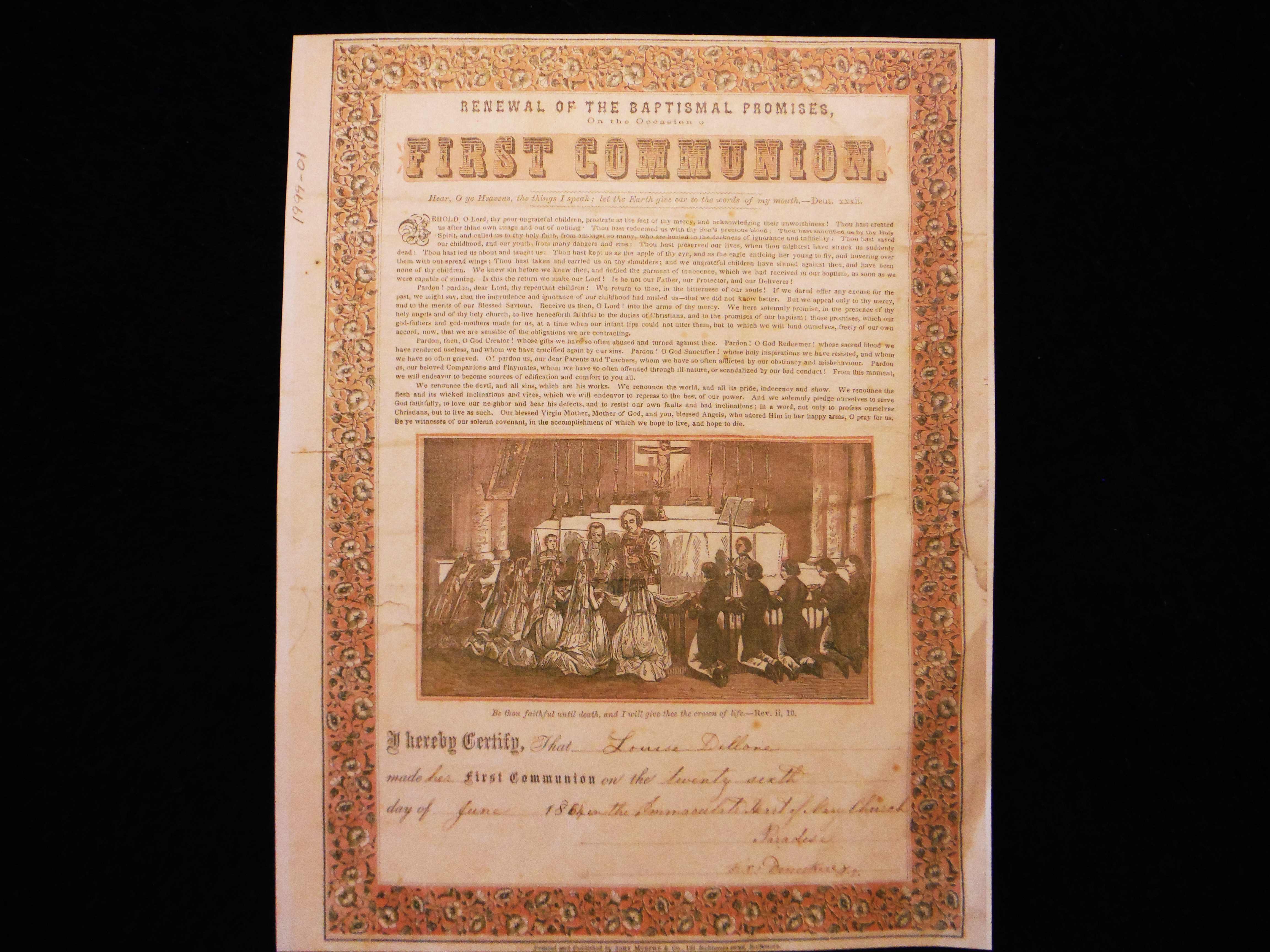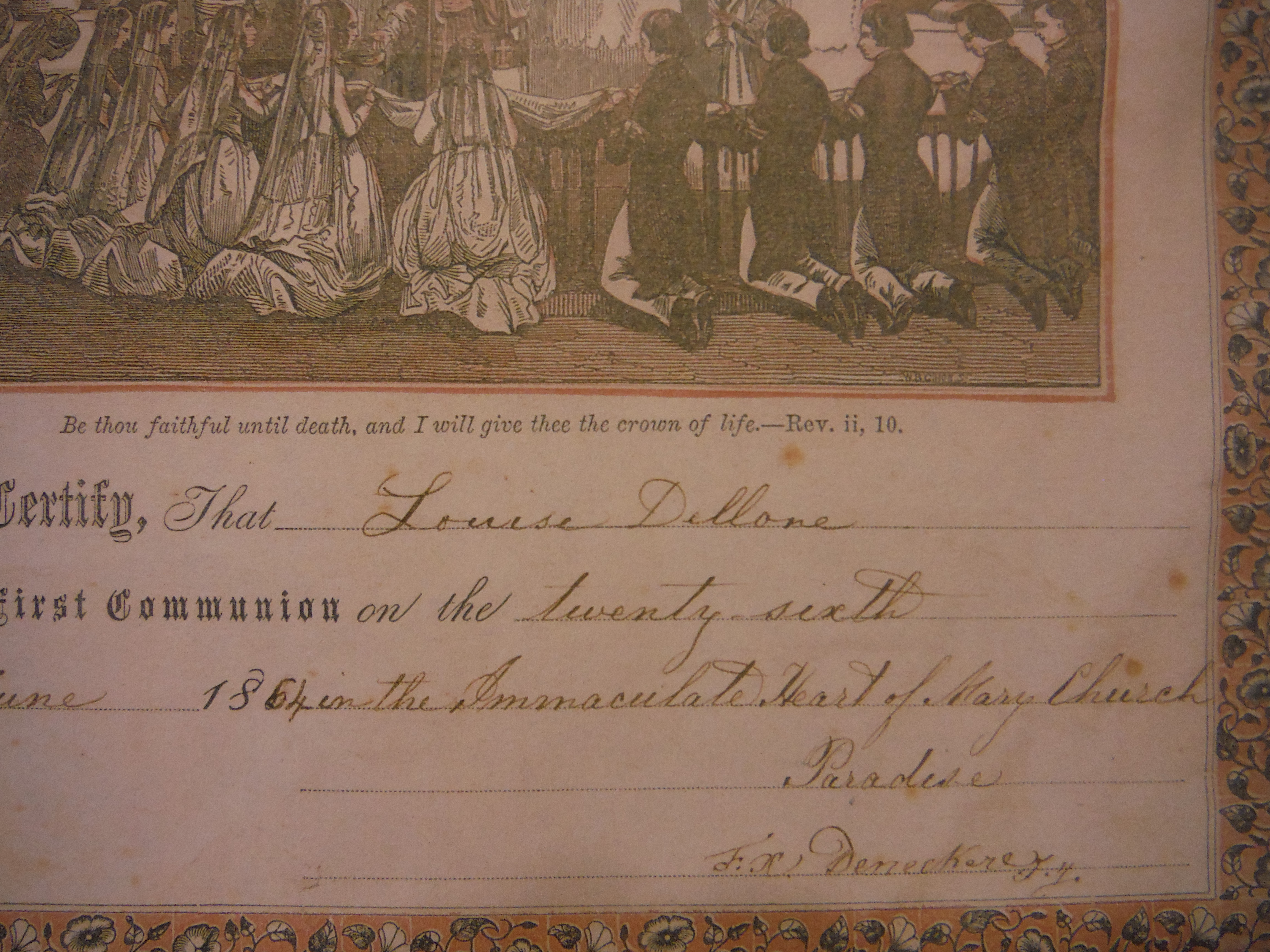 Louise Dellone's First Communion Certificate, June 26, 1864. The time was less than a year after the Battle of Gettysburg was fought and nearly a year before the end of the American Civil War. (June 2, 1865).
