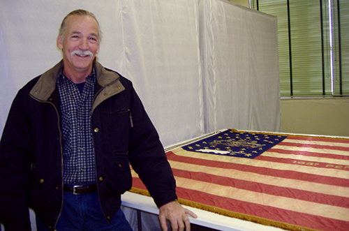 Above: Karl Orndorff stands beside the flag that the Bonneauville men of the Civil War served under.